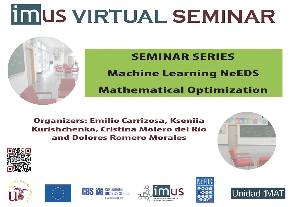 On September 20, 16.30 (CET), we are returning with the second season of the Online Seminar Series Machine Learning NeEDS Mathematical Optimization, https://congreso.us.es/mlneedsmo/. Please find attached the poster of the series with QR code to our website.